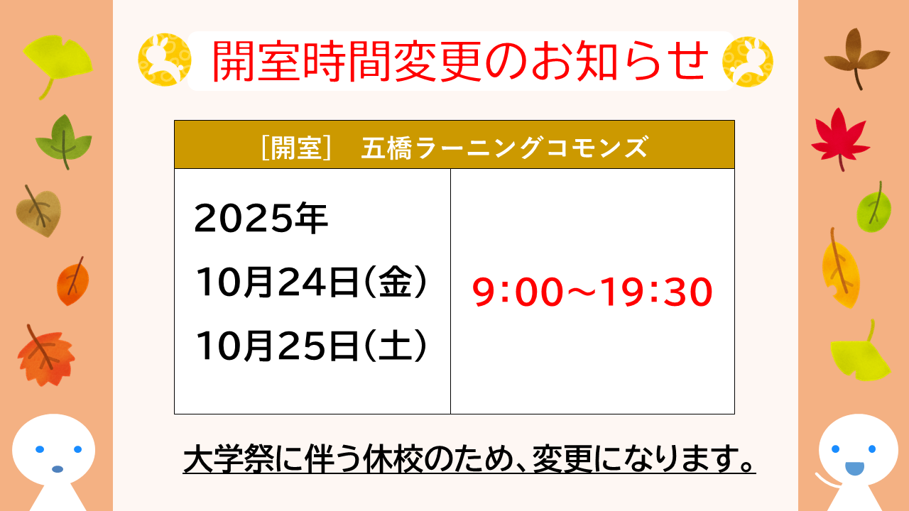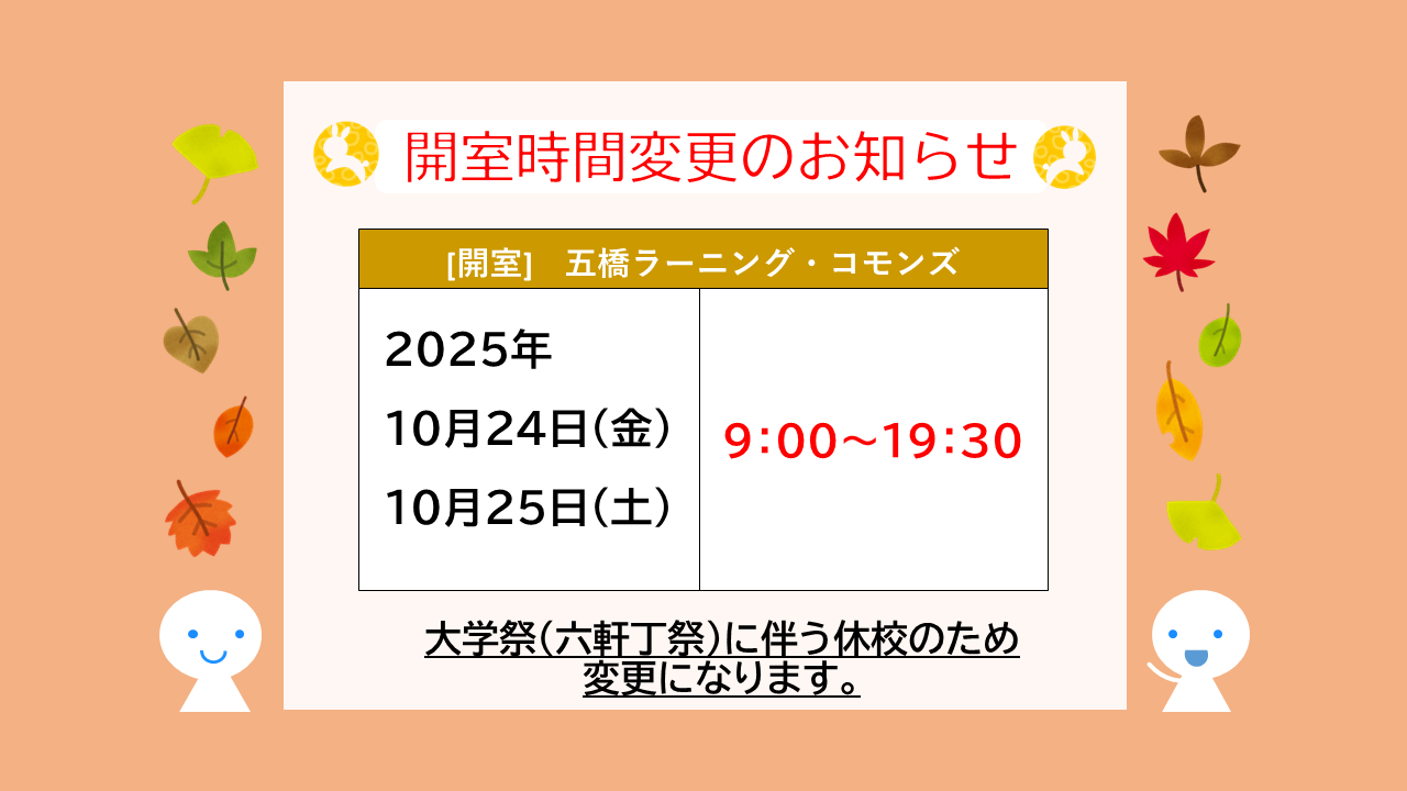 【五橋キャンパス】10/24、25開室時間変更のお知らせ