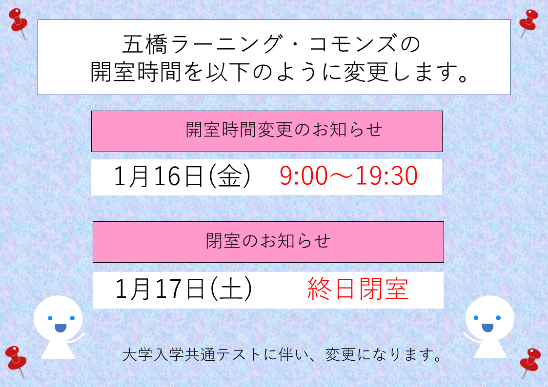 【五橋キャンパス】1月の開室時間変更のお知らせ