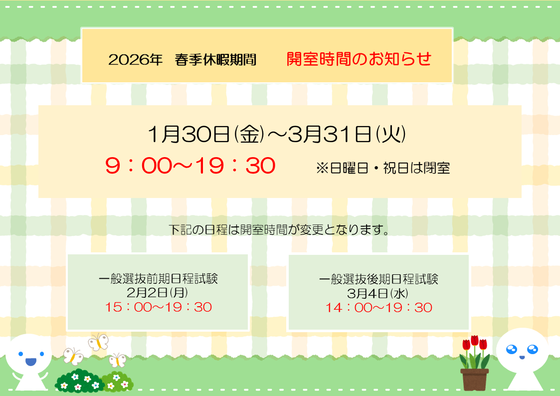 【五橋キャンパス】1/30~3/31春季休暇中の開室時間について