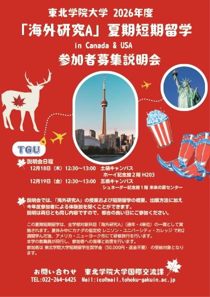 2026年度は、今年度に引き続きカナダ・オンタリオ州ウォータールーにある協定校 レニソン・ユニバーシティ・カレッジ に滞在し、同大学教員によるレクチャーを受講します。留学の終盤には、グループごとにニューヨーク見学旅行を行い、国際的な視野を広げる機会を提供します。また、出発から帰国まで本学教職員2名が同行し、学生の皆さんの留学生活をサポートします。