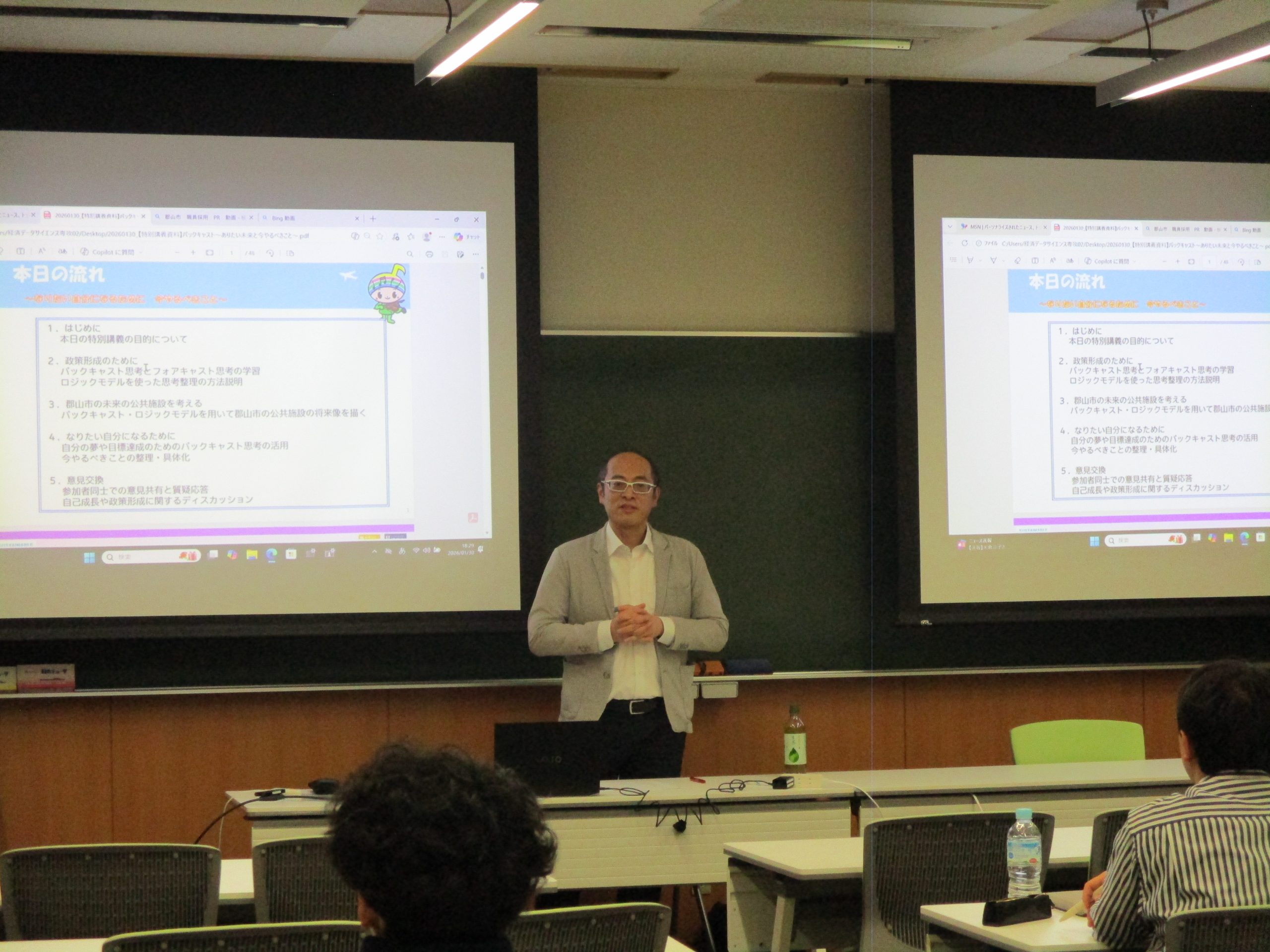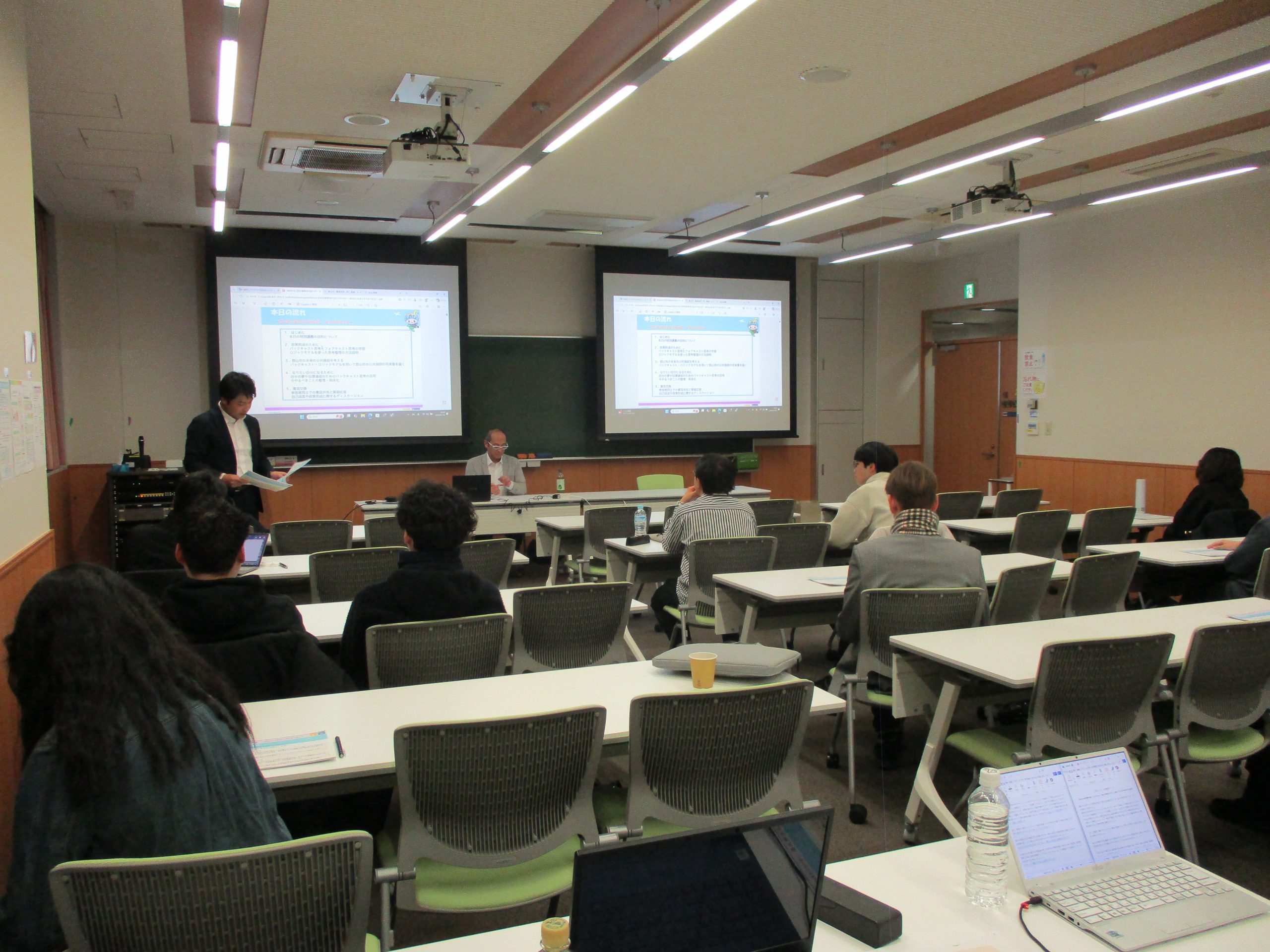講義では、市の政策形成で使われる「バックキャスト思考」「フォアキャスト思考」について解説いただき、今後30年後を見据えた公共施設等総合管理計画の改訂を事例に、政策を着実に進捗させるため、効果を検証しながら分析していく手法「ロジックモデル」を学び、講義で学んだ思考方法を活かし「なりたい自分になるために」のヒントを知る講義となりました。参加者は熱心に耳を傾け、講義後も活発な質疑応答が行われるなど大変充実した特別講義となりました。