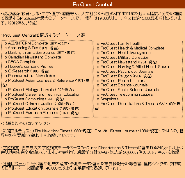 本学では今年度からProQuest Reserch LibraryとABI/INFORMをProQuest Centralへとグレードアップしています。また、2012年度からの新プラットフォームへの移行でより利用しやすいものとなっています。