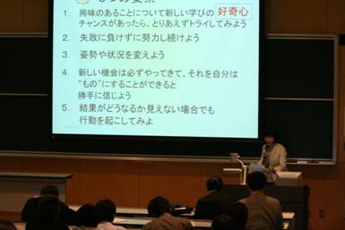 職業選択を間近に控えた大学3年生を対象に、仕事のやりがいとは何か、またそれはどのようにしたら見つけることができるのか…。10月27日、本学経営学部で主催による、「キャリアアンカー」と「プランド・ハプスタンス」の2つのキーワードを中心に職業選択と人生設計を考えるシンポジウムが開催されました。