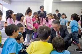 オープニングの前に園児たちを励ます平河内理事長と星宮学長