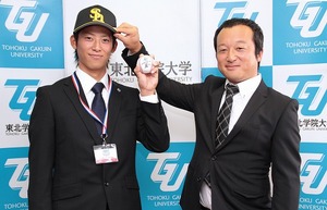 10月30日、先のドラフト会議でソフトバンクの2位指名を受けた、本学の伊藤祐介選手(経済学経済学科)を、ソフトバンクスカウト部の宮田義久部長補佐と、作山和英スカウトが泉キャンパスに指名あいさつに訪れました。
