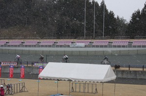 開会式の後、家族連れの参加者、現役競輪選手がウォーミングアップのために、思い思いの自転車で走り始めたものの、次第に雪が本降りになり、炊き出しのト ン汁を食べながら様子を見ることに。最終的に、トラックが濡れて滑りやすいため走行は危険と判断し、トラックミーティングは中止。予定していた走行会や現役競輪選手によるエキシビジョンレースは残念ながら中止となりました。