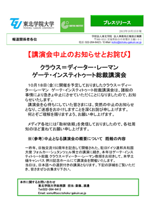 【講演会中止のお知らせとお詫び】クラウス=ディーター・レーマン ゲーテ・インスティトゥート総裁講演会 2013年10月15日 ブログ 新着情報バックナンバー 2025年 2024年 2023年 2022年 2021年 2020年 2019年 2018年 2017年 2016年 2015年 2014年 2013年 2012年 2011年