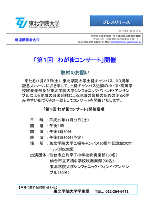 「第1回 わが街コンサート」開催 取材のお願い 2013年11月14日 ブログ 新着情報バックナンバー 2025年 2024年 2023年 2022年 2021年 2020年 2019年 2018年 2017年 2016年 2015年 2014年 2013年 2012年 2011年