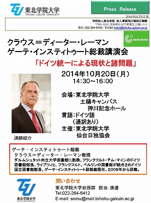 クラウス=ディーター・レーマン ゲーテ・インスティトゥート総裁講演会「ドイツ統一による現状と諸問題」 2014年10月08日 (クリックでPDF表示 307KB) ブログ 新着情報バックナンバー 2025年 2024年 2023年 2022年 2021年 2020年 2019年 2018年 2017年 2016年 2015年 2014年 2013年 2012年 2011年