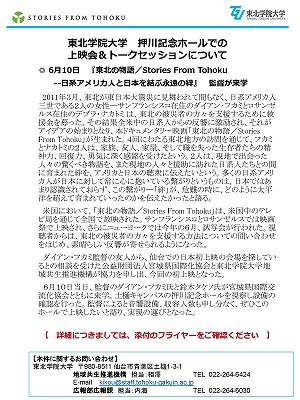 日系人が見たAfter 3.11 ドキュメンタリー「Stories From Tohoku 日系アメリカ人と日本を結ぶ永遠の絆」上映会&監督トークセッション 取材のお願い 2014年10月30日 (クリックでPDF表示1.44MB) (クリックでPDF表示4.55MB) ブログ 新着情報バックナンバー 2025年 2024年 2023年 2022年 2021年 2020年 2019年 2018年 2017年 2016年 2015年 2014年 2013年 2012年 2011年