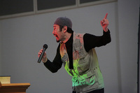 15時からは戦場カメラマン・ジャーナリストの渡部陽一氏を講師に招き、『~ファインダー越しに見た命の現場~戦場からのメッセージをあなたに』と題した教養セミナーが開催されました。大学生時代に訪れたアフリカで戦争や紛争によって傷ついた子どもたちがたくさんいるという実情を世界に発信するために戦場カメラマンになったこと。さらに、石油というエネルギー資源をめぐって中東で戦争が起きているなど、独特のやわらかい口調と大きなボディーアクションで戦場の実情をわかりやすく語ってくれました。講演の終幕は万雷の拍手で無事に終えることができました。