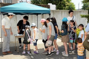 真夏日のなか、ワークショップ開始の午前10時、会場である博物館前の特設テントには近隣の小学生親子ら20組ほどが並びました。