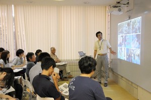 その後、中央図書館1階のアクティブコートに移動し、加藤幸治文学部准教授による「デフォレスト館の“屋根”から仙台の近代を眺めたら・・・」と題した第一部の講演会がはじまりました。国の登録有形文化財のデフォレスト館の雄勝石を使用したスレート屋根の建造について紹介しました。明治・昭和、そして今日、繰り返される津波から復興してきた雄勝硯石の産地の取組について解説しました。