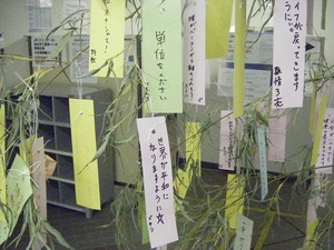 夏休み前の7月、この七夕の時期に、泉キャンパスの1号館と2号館のロビーに七夕飾りの竹が立てられます。暦の上の七夕(7月7日)を過ぎてから、次第に学生たちの『願い』をしたためた短冊が増え続けています。前期試験が迫っていることもあり「単位をください」、「楽しい大学生活が送れますように」というほほえましいもの、中には「東大に入りたい」(!?)など、意味不明なものまで文字通り、色とりどりの願いがぶらさげられています。