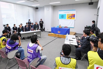 今夏の最高気温が更新されたこの日、ヴィッセル神戸とのホーム戦開始の前に、ユアテックスタジアム仙台(仙台市泉区)のインタビュールームにおいて午後5時50分から締結式が行われました。本学からは松本宣郎学長、阿部重樹学長室長、齋藤信二総務部長、そして教養学部の天野和彦准教授と学生4名が出席し、(株)ベガルタ仙台からは、西川善久代表取締役社長、竹鼻純常務取締役、白河広哉総務部長が列席し、協定書の署名が取り交わされました。![]()