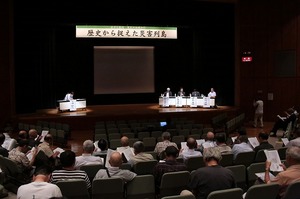 続いて行われたパネル討論「古代多賀城・仙台平野における震災と復興」では、本学文学部の七海雅人教授をコーディネーターに、基調講演に続いて保立道久氏、多賀城市教育委員会事務局文化財課の千葉孝弥参事、本学教養学部の松本秀明教授、本学文学部の佐川正敏教授が、過去に起きた地震や復興活動に関する専門の研究について、報告や意見交換が交わされました。最後はフロアからの質問にパネリストが答えるなど、会場が一体となって災害列島日本について考えるシンポジウムとなりました。