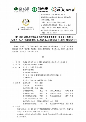「地(知)の拠点大学による地方創生推進事業(COC+事業)」『みやぎ・せんだい協働教育基盤による地域高度人材の育成に関する協定』締結式について 2016年02月09日 (クリックでPDF表示 218KB) ブログ 新着情報バックナンバー 2025年 2024年 2023年 2022年 2021年 2020年 2019年 2018年 2017年 2016年 2015年 2014年 2013年 2012年 2011年