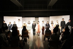 会場となった泉キャンパスの多目的ホールでは、小劇場さながらに設えられた舞台と客席が観客を迎えました。用意された50席は早々に埋まり、緊張と期待がないまぜとなった静けさの中、劇場が暗転。スポットライトの下に現れた女優のモノローグにより、公演が始まりました。
