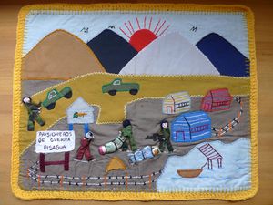 アルピジェラ arpilleras : チリの軍政期(1973年~1990年)、貧民地区の女性が中心となって、地区の暮らしの実情や政治抑圧の様子を描いたタペストリーを縫っていったもの。古布や身近な材料を使って作られており、中には行方不明者の衣服を用いてその家族が作った作品もある。アンデスの山々(自然風景)と貧民地区特有の光景(社会風景)を背景に、地区内の助け合いや、軍政下の人権侵害を訴える活動の様子が描かれる。2000年代後半からヨーロッパを中心として展示活動が広がる。紛争や政治暴力を経験した地域では、アルピジェラの手法を通じて辛苦の記憶や社会経験を作品化する活動も活発化している。