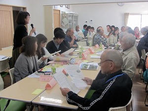 その後に行われたワークショップでは、学生が進行役となりグループごとに思い出や情報交換、議論を交わし、最後にグループのまとめを話しました。「古くから伝わる海・貞山堀・農業を大切にしたい」「復興のためにももっと多くの人で賑わう場になれば」「学校と連携し、海岸の新たな生態系の観察や松の植樹など、学びの場を提供したい」などといった意見が出たほか、住民の思い出を語る場となっていたグループもあり、新浜のまちづくりについて今後の展望や希望を見いだす時間となりました。