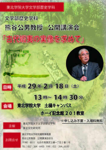 本年3月末日をもって定年退職される熊谷公男教授(文学部歴史学科)の講演会を、下記のとおり開催いたしますのでご案内申し上げます。