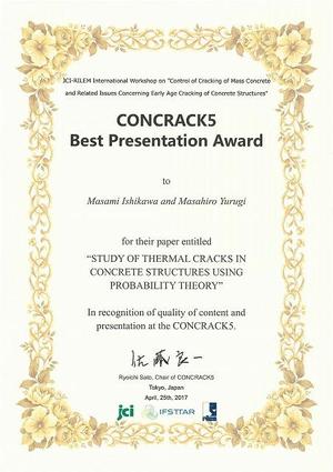 受賞論文:”Study of thermal cracks in concrete structures using probability theory”