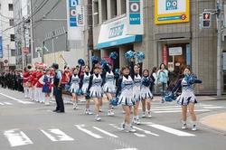 初日の3日は11時から市内中心部の繁華街で両校の応援団、チアリーディングチーム、吹奏楽部による華やかなパレードが行われ、ショッピングを楽しむ多くの市民に伝統ある定期戦の開催をアピールしました。道行く人々は足をとめて、力強い吹奏楽の演奏にスマートフォンで録画や写真を撮る人たちもおり、声援を送っていました。