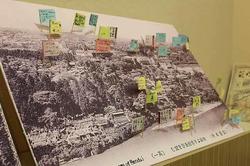 東北学院大学博物館に戻ると、絵葉書に描かれた風景と愛宕神社から見た風景とをもとに、参加者ひとり一人の思い出を旗として立てるワークショップを行いました。現在もある建物の名前やない建物の名前、自分が住んでいる家の場所、お気に入りの場所や、中には広瀬川が凍った時にスケートをした思い出や、広瀬川でボートに乗ったこと、魚を釣ったという思い出といった、参加者自身の思い出話を思い思いにデコレーションした旗にして絵葉書の上にたくさん立てることができました。