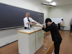 235教室には受賞者が集まり、特待生30名・入学時特待生継続者4名を代表して法学部法律学科2年の中村舞菜さん、優等生92名を代表して教養学部情報科学科4年の佐藤佑樹さんが、松本宣郎学長より表彰状と記念品を授与されました。
