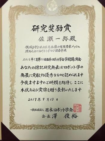 機械知能工学科の佐瀬一弥助教が第34回日本ロボット学会学術講演会で「研究奨励賞」を受賞し、9月13日に東京で開催された第35回日本ロボット学会学術講演会で表彰されました。