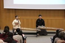 休憩を挟んだ後半は、20世紀初頭に朝鮮で生まれた箏曲についてのレクチャーから始まり、400曲以上の自作曲を残し、近代音楽を語る上で欠かすことのできない宮城道雄がクローズアップされました。「宮城は一家の生計を支えるために13歳で朝鮮に渡って箏や尺八を教えましたが、早くから音曲教授生活に入ったためのレパートリー不足という悩みを、自ら新曲を作ることで打開したのです。処女作の《水の変態》は、水が霧・雲・雨・雪・霰・露・霜に姿を変える様を描いた『高等小学読本』所載の和歌7首を歌詞にした曲ですが、100年経った今聴いても色褪せることなく、新鮮な響きを保っています。」と述べられました。平田氏と村澤氏による繊細な合奏で見事に表現された水の様子に、聴衆は想像力を大いに掻き立てられたに違いありません。
