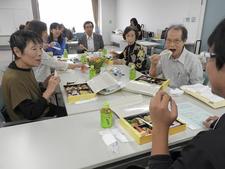 時計が12時を回ったところでお食事会がスタート。学生ボランティアや教職員、世話役の皆さんも一緒のテーブルについての食事会です。合間に参加者のスピーチが織り込まれ、本日の最高齢者と紹介された94歳の五十嵐定さんは「若い人たちとお話ができて若返ります」と語り一層場を和ませてくれました。会場は終始和やかな笑いと会話でお昼のひと時を楽しく過ごしました。