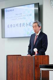 一人ずつ履修証明書が手渡された後、阿部重樹地域共生推進機構長は「制度のはざまにある問題への対応は難しく、今後ますますCSWの活躍が求められます。そのような中、このプログラムを修了された皆様には、周りの方よりも先に立って、CSWの役割を担っていってほしいと思います。」と祝辞を述べました。
