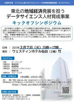 2022年度に本学が採択を受けた文部科学省補助事業「デジタルと掛けるダブルメジャー大学院教育構築事業」(本学申請事業名:東北の地域経済発展を担うデータサイエンス人材育成事業)について、以下のとおり、キックオフシンポジウムを開催することとなりましたので、ご案内いたします。