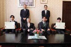 2月9日、土樋キャンパスで学長表彰授与式が行われ、大学院工学研究科電子工学専攻で磁性材料研究室に所属する森裕一さん(博士後期課程1年)と畑中辰汰朗さん(博士前期課程2年)に、大西晴樹学長から表彰状と記念品が贈られました。