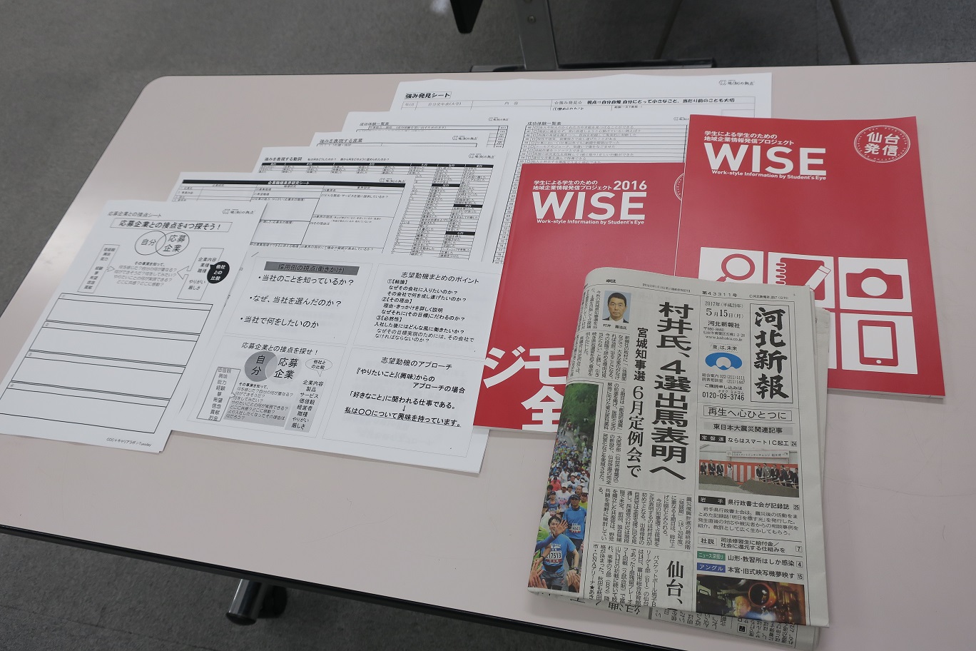 今回のセミナーでは、COC+参加大学等の学生を対象に、自己理解、企業理解の観点から、自分にしか言えない「志望動機」を作るコツを学びました。内容としては、志望動機のまとめ方、自分の強みについての抽出、企業研究の手法及び自分と応募企業との接点の探し方について、講義と個人ワーク・グループワークの中で、ワークシート等を使いながら深く考えました。また、資料として河北新報朝刊及びWISEの冊子を使用しました。