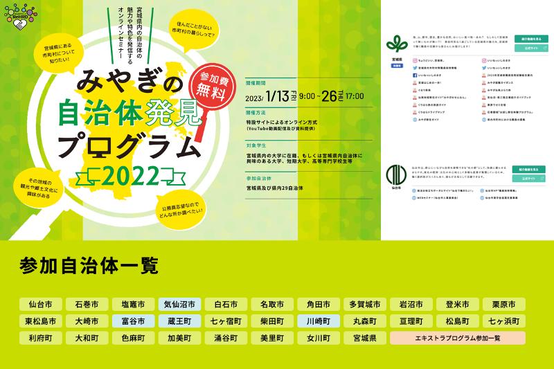 本事業は、文部科学省の補助事業「地(知)の拠点大学による地方創生推進事業(COC+)」(2015年度〜2019年度)で選定を受け実施された「みやぎ・せんだい協働教育基盤による地域高度人材の育成」によって構築された連携関係を承継する形で、14の事業協働機関によって2020年12月に協定を締結し立ち上げられました。また、翌2021年5月には、新たに3機関がプラットフォームに参画すると同時に名称を「みやぎ・せんだい地域人材育成協働事業プラットフォーム」に変更し、17の事業協働機関の連携により、教育カリキュラムの運営支援、キャリア育成活動の支援、地元定着の推進活動に協働で取り組んでいます。