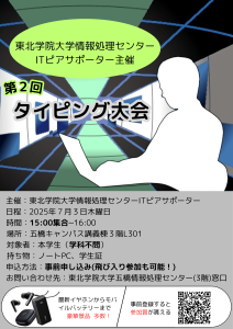 【情報処理センターITピアサポーター】第2回タイピング大会開催について 2025年6月12日 最終更新日時 : 2025年10月17日 tgipc 7月3日(木)15:00から東北学院大学情報処理センターITピアサポーター主催第2回タイピング大会を開催いたします。 楽しくタイピングスキルを競い合い、上位入賞者には賞品をさしあげます。 タイピングスキルを楽しく向上できる機会です。 日々のPC作業をもっとスムーズにしたい方、タイピングに自信がある方、ぜひご参加ください。 詳しくは大会ポスターをご覧ください。