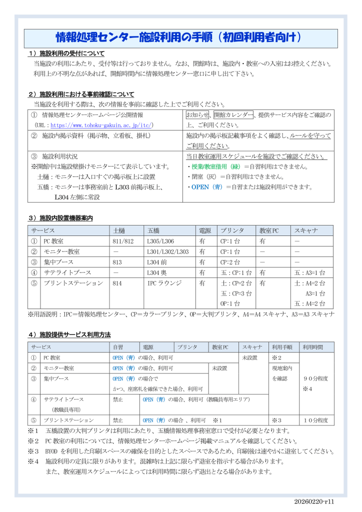 また、提供サービスの詳細については本サイト掲載内容や情報処理センター施設内掲示資料をご確認の上、ご利用ください。
