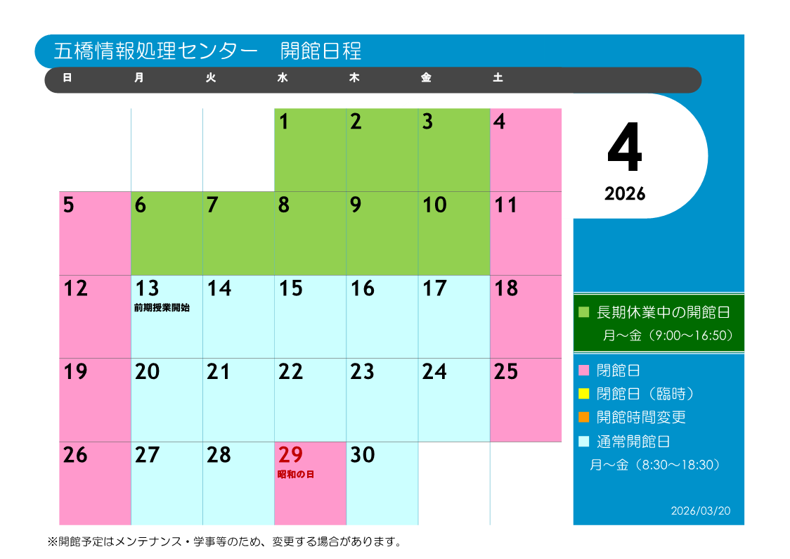 五橋情報処理センター開館カレンダー(2026年4月)