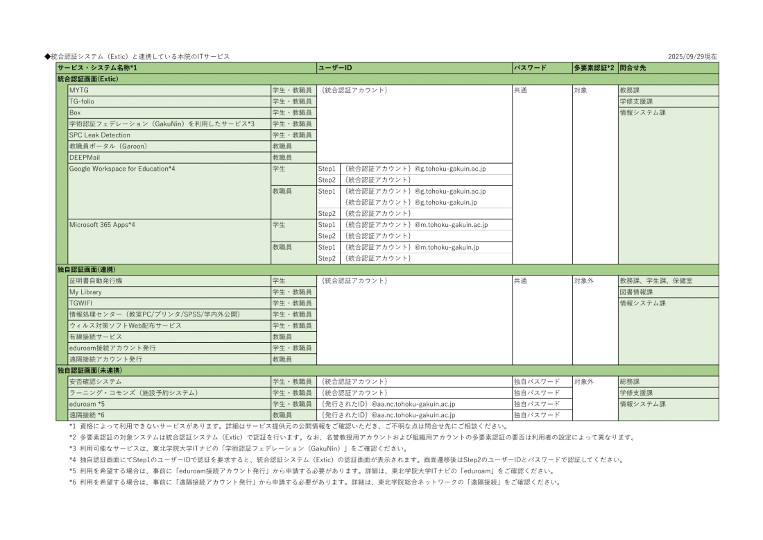 統合認証システムと連携している本院のITサービスについては、以下の表をご確認ください。ITサービスによっては、同一のアカウント情報を利用していても、『ログイン画面』が異なる場合や独自の運用ルールを持つ場合があります。