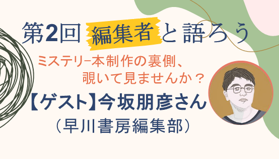 話題となった本の著者や編集者をお呼びして、お話を聞く「著者・編集者と語ろう」の第2回目を開催します。今回のゲストは、早川書房の編集部で雑誌「ミステリマガジン」、海外ミステリ本、国内ミステリ本の編集を行っている今坂朋彦さんです。