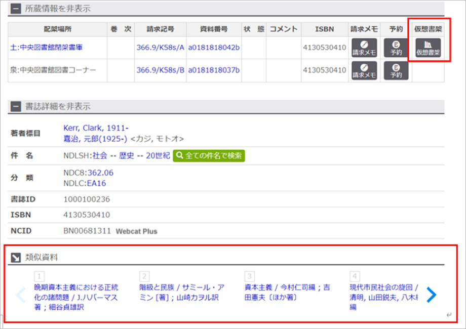 ・検索した図書のページにある「所蔵情報」の一番右の列にある「仮想書架」をクリックすると、その本が配架されている棚の両隣20冊分の情報をのぞき見することができます。