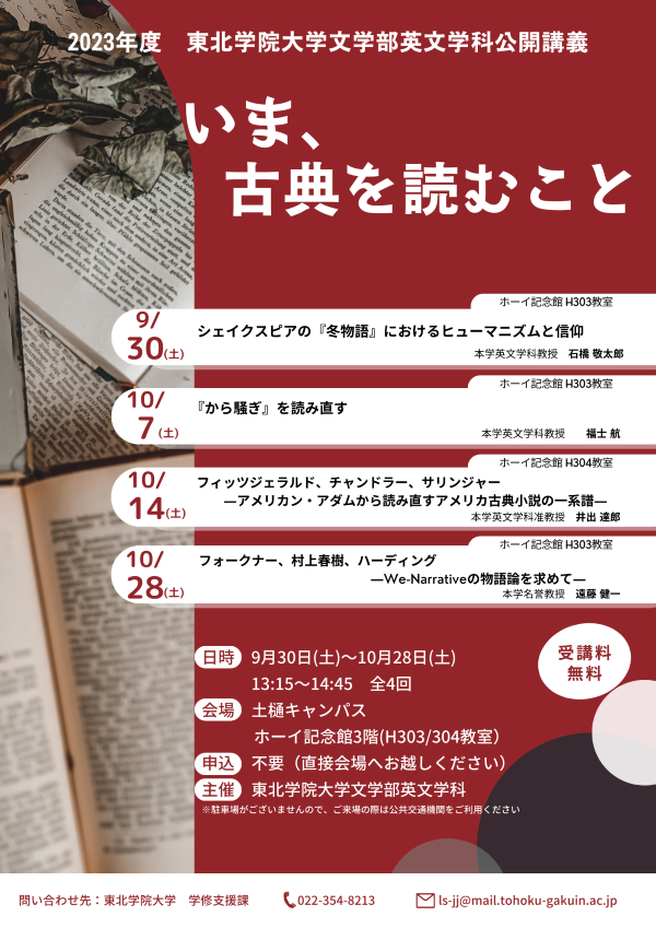 1947年に発表されたアルベール・カミュの『ペスト』は、コロナ禍において世界中で読み直され、ベストセラーになりました。そしてまた、光文社の「古典新訳文庫」シリーズやNHKのテレビ番組「100分de名著」は、10年以上前に始まりながら、現在もなお人気のコンテンツとして親しまれています。こうした近年の傾向は、活字離れや流行の移ろいやすさが言われる一方で、古典と呼ばれる文学作品が、「いま」という時代において読まれ続けていることを示しているでしょう。「いま、古典を読むこと」、本講座では、英米文学の古典を題材に、この問いについて皆さんと一緒に考えていきたいと思っています。