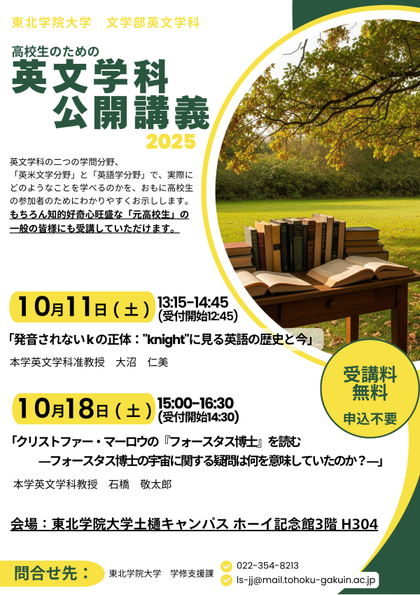 英文学科の二つの学問分野、「英米文学分野」と「英語学分野」で、実際にどのようなことを学べるのかを、おもに高校生の参加者のためにわかりやすくお示しします。もちろん知的好奇心旺盛な「元高校生」の一般の皆様にも受講していただけます。