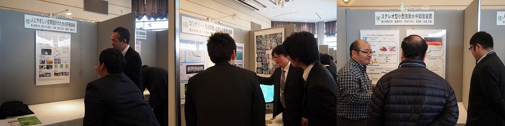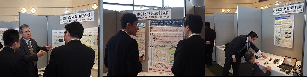 本学からは工学部電気情報工学科 岩本正敏 准教授/教養学部人間科学科 岡崎勘造 准教授/工学部機械知能工学科 小野憲文 教授/工学部電子工学科 加藤和夫 准教授/工学部環境建設工学科 武田三弘 教授/教養学部情報科学科 松尾行雄 准教授がポスターを展示しました。