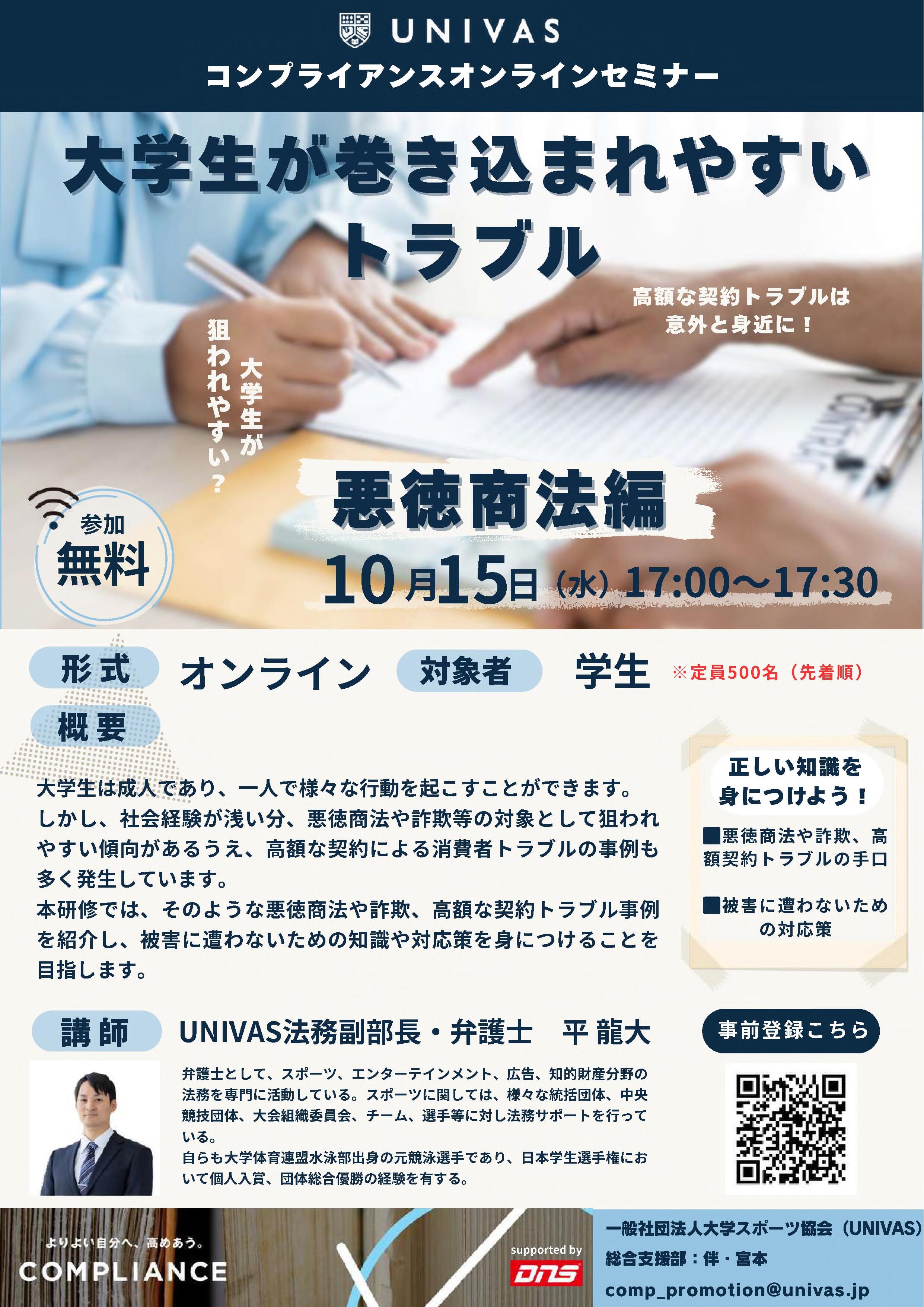 大学スポーツ協会(UNIVAS)主催 コンプライアンスオンラインセミナー(悪徳商法編)のご案内 (2025.09.26)