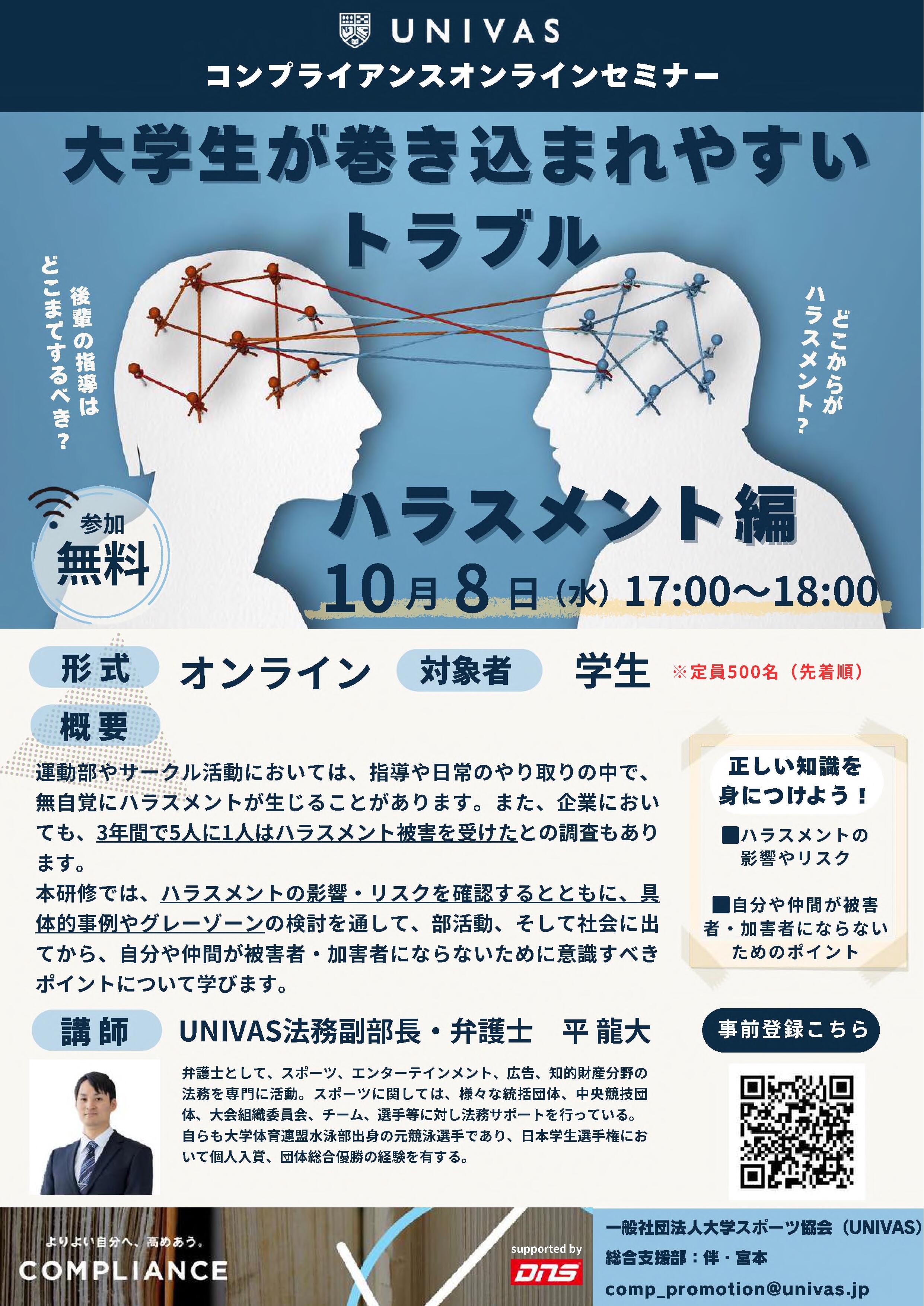 大学スポーツ協会(UNIVAS)主催 コンプライアンスオンラインセミナー(ハラスメント編)のご案内 (2025.09.26)