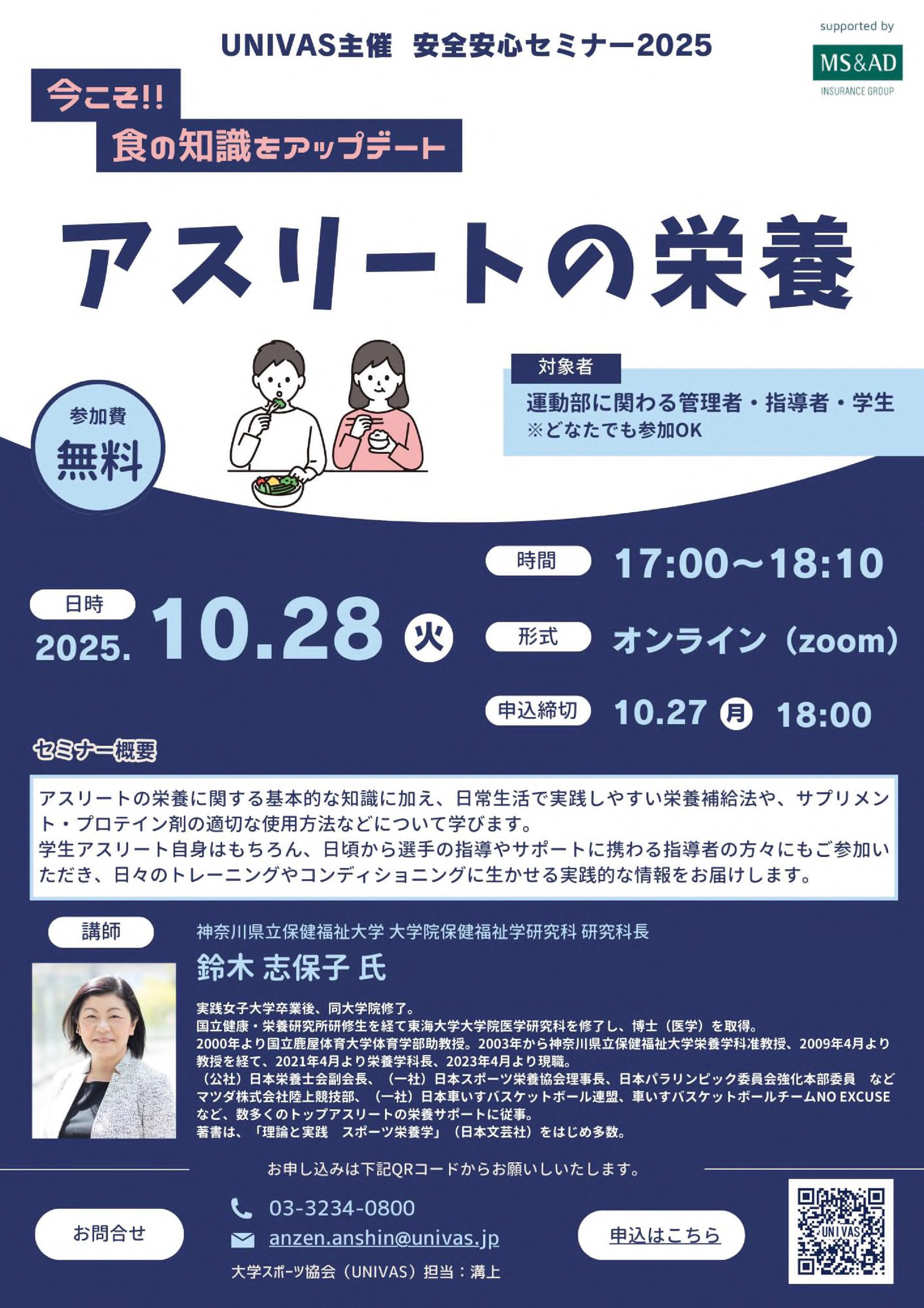 大学スポーツ協会(UNIVAS)主催 安全安心セミナー2025(アスリートの栄養)のご案内 (2025.09.26)