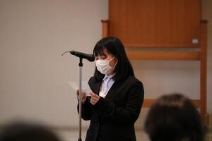 第一部の冒頭、岩谷幸雄文団連会長より「皆さんの活動を広く発信していってください。それが本学そのものの雰囲気をつくることになります。来年度開学する五橋キャンパスを文化部の香り豊かなキャンパスにしてほしい」と挨拶があり、その後大西晴樹学長らが祝辞を述べました。これを受け、新入生代表の植田涼音さん(演劇部)は「文団連の一員としての自覚をもち、今後のサークル活動に励んでいく所存です。これからも活動上の工夫をしながら懸命に取り組んでいきたい」と抱負を語りました。